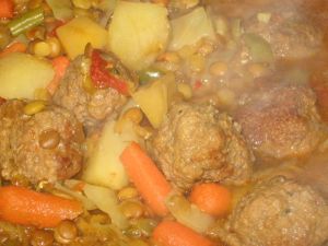 This is a really hearty and nutritious stew (delicious, too!)…and great for a chilly day like today. It’s also an interesting way to utilize meatballs other than in tomato sauce. I seasoned it with cinnamon, cumin, allspice, smoked hot peppers, and lemon…this gave it a distinctively Middle Eastern flavor and the aromas permeating the house are enough to make your mouth water.