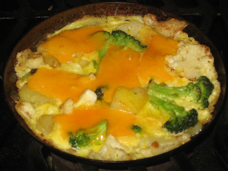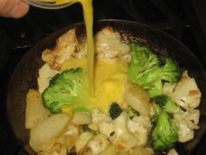 Preheat your oven to 350F, then chop the broccoli and cauliflower and microwave the potato until it is “just cooked” (yes, I actually own a microwave…a small one; I use it rarely, mostly for reheats, and I just purchased it–my first one–last year). Then saute everything in olive oil until it begins to brown.