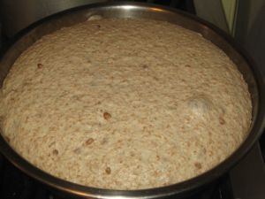 Then I measured 2 cups of cooking liquid and combined it with two cups of whole wheat flour and a couple teaspoons of instant yeast. If there are not two cups of liquid remaining (because of evaporation) replenish it with cool water…this forms the initial sponge, or preferment. This can be left at room temperature for as little as 1/2 hour or up to 12 hours (and in the refrigerator for a couple days); I went out for the day and came back to it about 6 hours later. It was predictably frothy and…well, sponge-like.