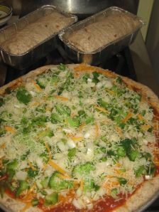 Now here’s the fun part: making the pizza. After preheating the oven to 450F I cut the dough into two pieces. One piece I rolled onto a pizza pan and the other I cut into two more pieces and shaped into 2 small loaves.