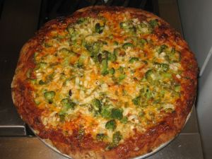 Pizza toppings are seemingly endless (I usually just use whatever I have at hand) and after scrutinizing my small refrigerator and freezer this is what I came up with: frozen tomato sauce (from this past summer’s tomatoes), broccoli, onion, green peppers, and four types of cheese.