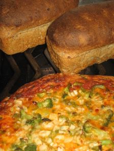 By the time I thawed the tomato sauce and topped the pizza it was ready to go in the oven. I cooked it for about twenty minutes…until it was a crispy, golden, bubbly pie of goodness. After the pizza was cooked (and while my son and I ate it) I baked the bread. It’s as simple as that.