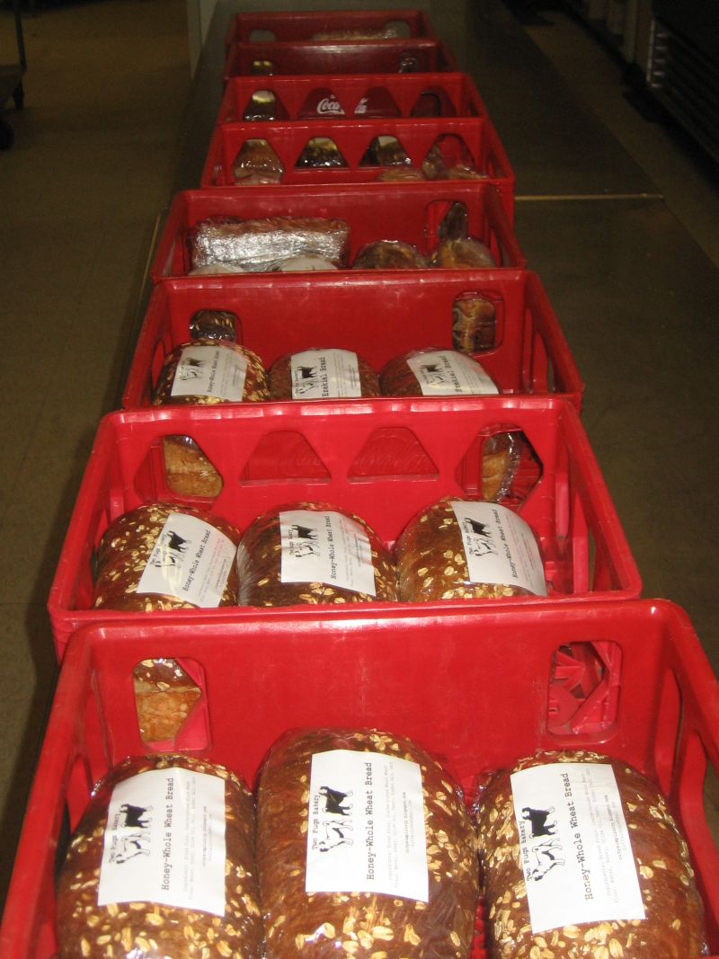 Thirty loaves of bread in eight plastic crates (honey-whole wheat bread, sundried tomato-asiago bread, Ezekiel bread).