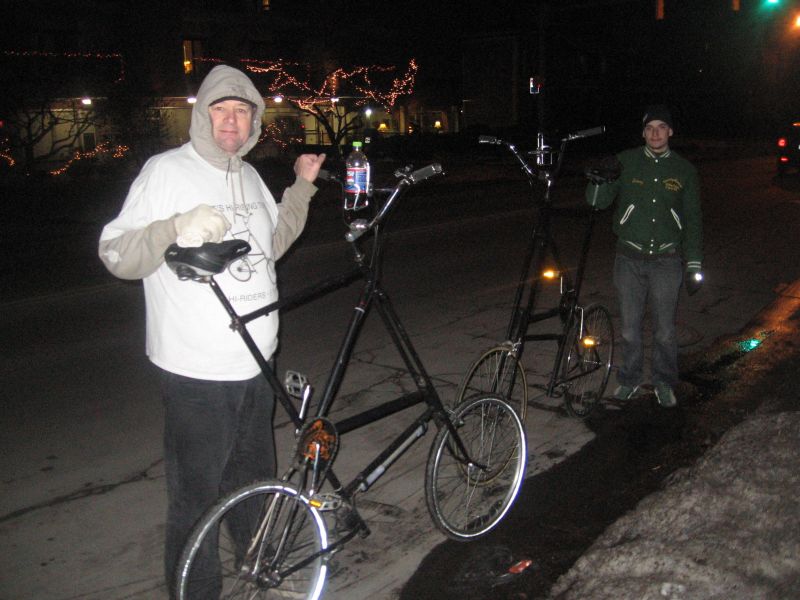 It was such a nice winter evening tonight that I chose to walk rather than ride. I was walking down Elmwood Avenue when I see these two guys pull out of a driveway onto the street on tall bikes. I have never ridden a tall bike, nor do I intend to. But I do have great respect for the bikes and their builders. As far as I know there are no commercially produced tall bikes on the market, so if you want one you have to build it yourself or have it built. What I really like about tall bikes is there impracticality. Yes, I know this sounds like an oxymoron, but it’s not. Tall bikes, to me, do not seem like they are practical at all other than riding them for fun. And that’s the bottom line…that’s the reason I truly like riding my cargo bikes, particularly the Mundo, because it’s fun. When these two guys pulled out onto the street their tall skeletal-like silhouettes looks graceful, almost like giraffes on wheels. Anyhow, as they rode past I uncharacteristically called out and asked if they would mind if I could take their picture. I told them I would like to post them on my blog. The rider on the left is Jason and his friend is Chris. Jason is the builder and also blogs about his bikes (http://hiridingbikes.blogspot.com). After a brief conversation about bikes and blogging they gracefully and giraffe-like lumbered away. Thanks guys; ride on!