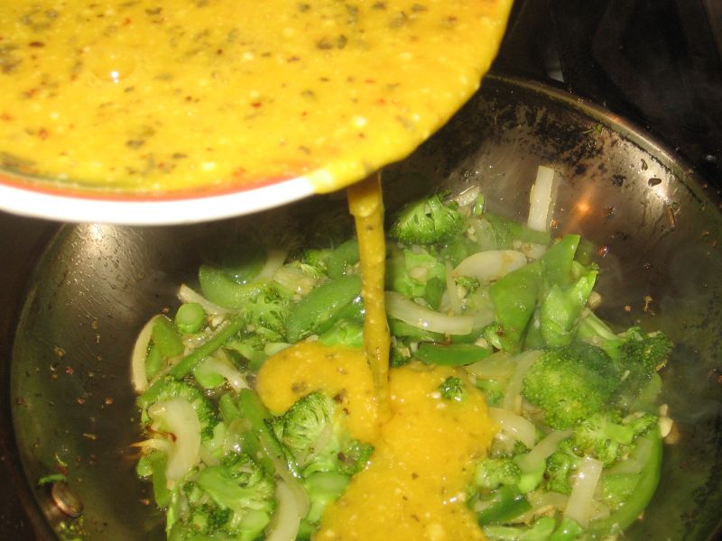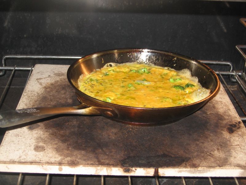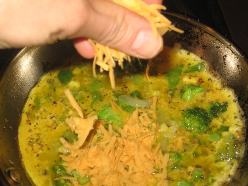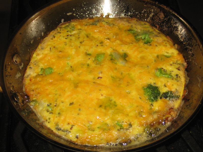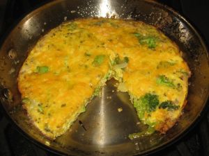 Preheat an oven to 375F. Combine the eggs, Parmesan, milk, red pepper, basil, and salt in a small bowl; whisk together and set aside. Heat the olive oil in an ovenproof skillet. Add the onion, green pepper, and broccoli; saute the vegetables for a couple minutes, or until they just begin to brown. Add the garlic and saute another minute. Pour the egg mixture over the vegetables then top it with the shredded cheddar. Place the skillet in the preheated oven for about 5-10 minutes, or until the eggs are just set.
