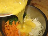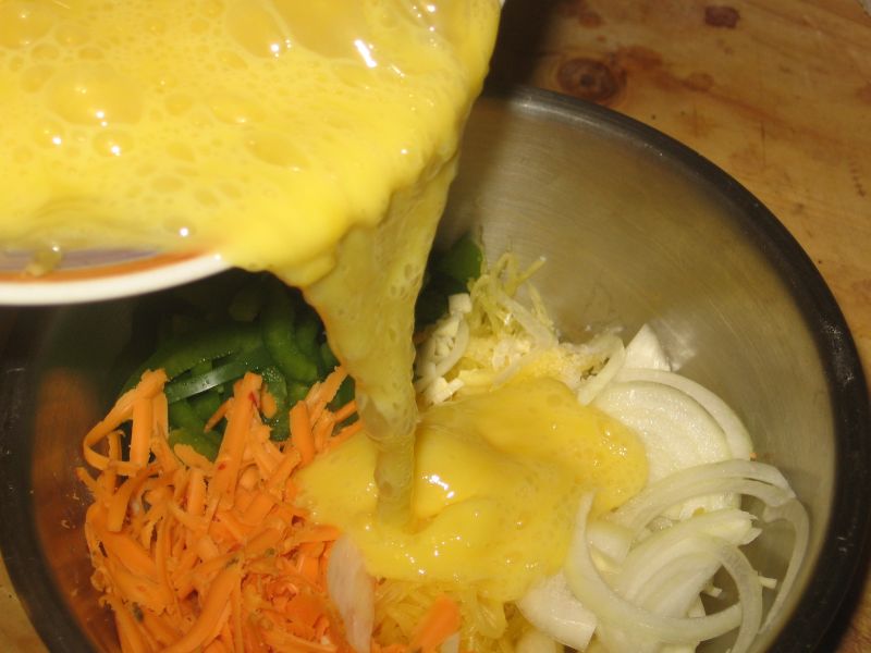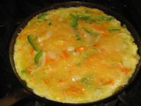 Combine the squash with a couple eggs and other ingredients. I added raw onion, bell pepper, shredded Buffalo Wing Cheddar Cheese, a little garlic, and a pinch of gray sea salt. Mix the items together, then pour them into a preheated oven-proof skillet that contains a few tablespoons virgin olive oil. Place the pan in a preheated oven for about 10 minutes…enough time to pour yourself a glass of wine, cut some fruit, etc. I did eat this with a glass of wine and I couldn’t help but think of the title of one of my favorite food books, An Omelet and a Glass of Wine, by Elizabeth David…the food writer who not only inspired the way I write about food, but actually influenced how I cook…but that’s another story, or at least another blog post.
