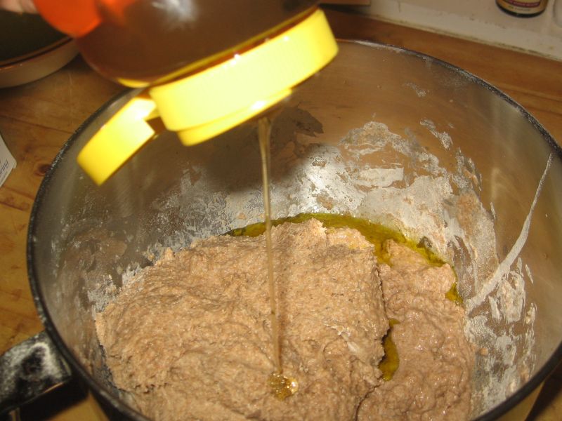 After the dough soaked/fermented for a couple hours at room temperature I combined them and added honey, olive oil, and kosher salt. Then I mixed the dough.