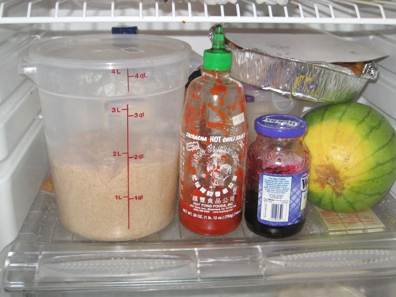 Next I placed the dough in a lightly oiled rising bucket in my teeny refrigerator until morning.