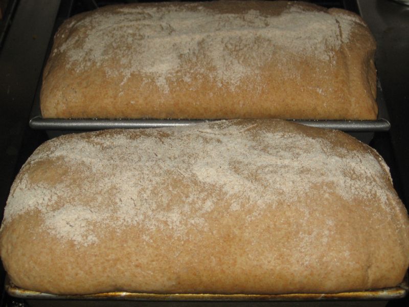 By morning the dough had doubled in size, but was of course refrigerator-cold. I cut it into tow pieces, shaped it and placed it in two loaf pans. After covering it with plastic wrap I went about my daily business and checked on it sporadically. At room temperature it took about 3 hours to rise.