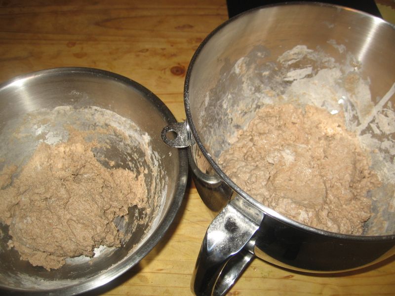 I started by soaking the flour in two separate containers; 1/3 of it with yeast, 2/3 without yeast. Both of these, I suppose could constitute being called a biga, or an Italian version of a firm pre-ferment.