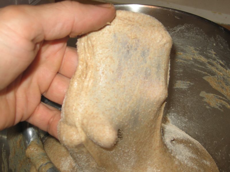 The crucial thing with any bread dough is kneading. When you knead dough you are essentially stretching and aligning the proteins (gluten) in the flour. These cling to one another and form long strands and give the dough it’s muscle, if you will. For this reason a dough that is high in fat, like many pastries, is called a “short dough,” or a dough with short protein (gluten) strands. Anyhow, a simple way to check to see if you have kneaded the dough long enough is the “windowpane test.” This is a very simple test and so called because the dough should stretch as thin as a windowpane (or thinner) without tearing.