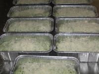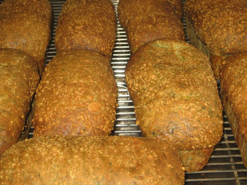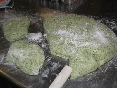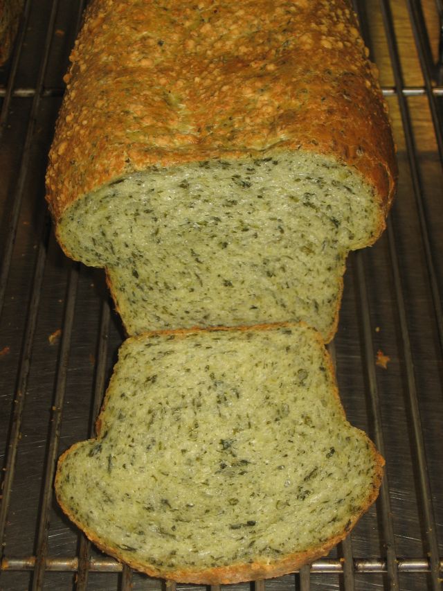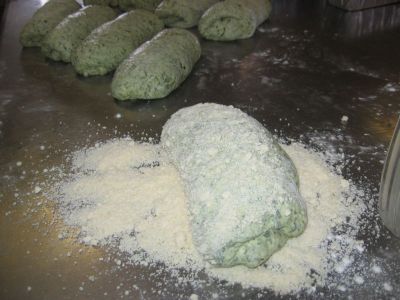 This recipe is an example of how you can take the basic recipe for bread and add other ingredients to make it completely different. I used all unbleached white bread flour in this recipe (no whole wheat) because I wanted it light and airy. The recipe is a large batch recipe that makes 9 loaves, 1-pound each. It sounds like a lot but 1-pound loaves are actually pretty small. You could also make 4 loaves, 2-pounds each if you like (or just cut the recipe in half or quarters). The amount of spinach called for in the recipe may seem like a lot as well (a 3-pound box), but it’s not. By the time you squeeze all the water from the spinach you really only end up with a few handfuls. If you’d like to omit the eggs from the recipe that is possible but they do add to the lightness and richness of the finished bread. And finally, like any recipe that I post (or any that exist, I suppose) this is merely a guide, the options are limitless. The vegetable and cheese may be substituted or exchanged for whatever suits your fancy. A traditional written recipe follows the pictures.