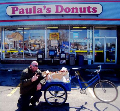 You may have read my post about the recently sold trike…it’s a good machine but definitely needed some TLC. The new owners are Andreea and Jason. When I sold it I asked them if they would send a photo or two of the trike when it was refurbished. Well the trike made a speedy recovery and is back on the road. Here’s photo of Jason flashing the peace sign while doing some serious grocery shopping. Thanks Jason; ride on.