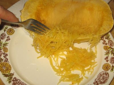 Once it is cool enough to handle (I usually pick it up with a towel), pull the innards of the squash onto a plate…it will shred naturally into spaghetti-like strands, hence its name.