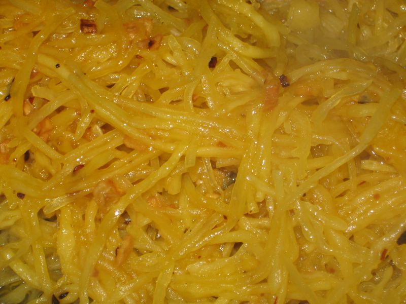 Add the still-warm squash to the pan and toss and stir it into the flavored oil. If you’d like, chopped parsley and Parmesan cheese are also excellent additions. This makes a great side dish, or even the bed to a main course with sauteed chicken or shrimp. Delicious.