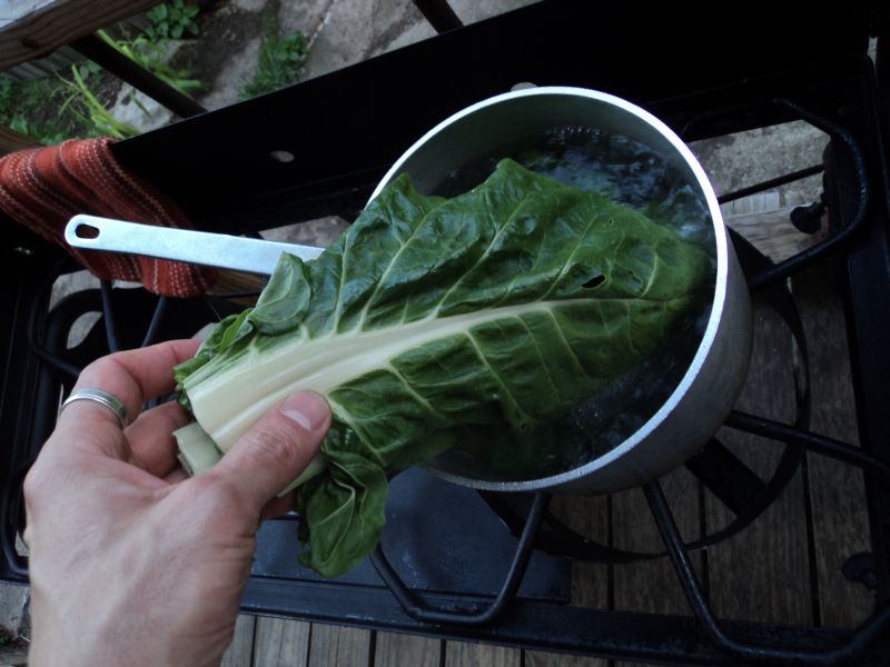 Anyhow, after spending the day in a sweltering kitchen I was in my teeny front yard garden watering newly plated vegetables and wondering what to make for dinner. After almost tripping over a giant Swiss chard plant that grew back from last year (pictured above) I thought…duh…do I need to get hit over the head with this to eat it. My son was at his mom’s house and I was home alone and wanted something simple (which I often do), but also something nourishing and good. So I opted for a Swiss chard omelette.