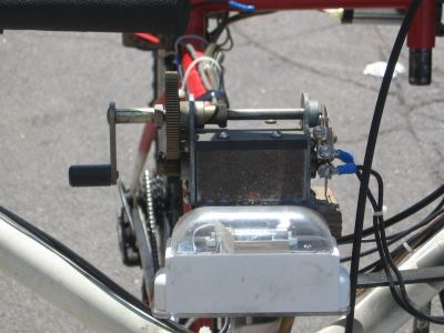 Anyhow, I was on my way home from the Bike Blessing a week or so ago and had my camera on me when I saw him and a friend pedaling this crazy side-by-side tandem down Elmwood Avenue. This thing is so loaded with gadgets it seems almost sarcastic…as if it is a parody of a car or something. Here’s a few photos: A hand crank telephone complete with old-fashioned ringer, a fully functioning retro CB radio, a rear LED flashing sign (that said “Your Ad Here” and functioning turn signals, and best of all was the battery operated air pump (which he turned on and asked I needed air in my tires).