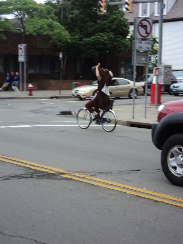 I saw this yesterday almost simultaneously: a person riding by dressed as a donkey on a bike, and when I looked down to adjust my camera there was a spent wasp’s nest on the sidewalk. Weird, I thought. Weird enough to post. You’d never notice this stuff driving in a car.