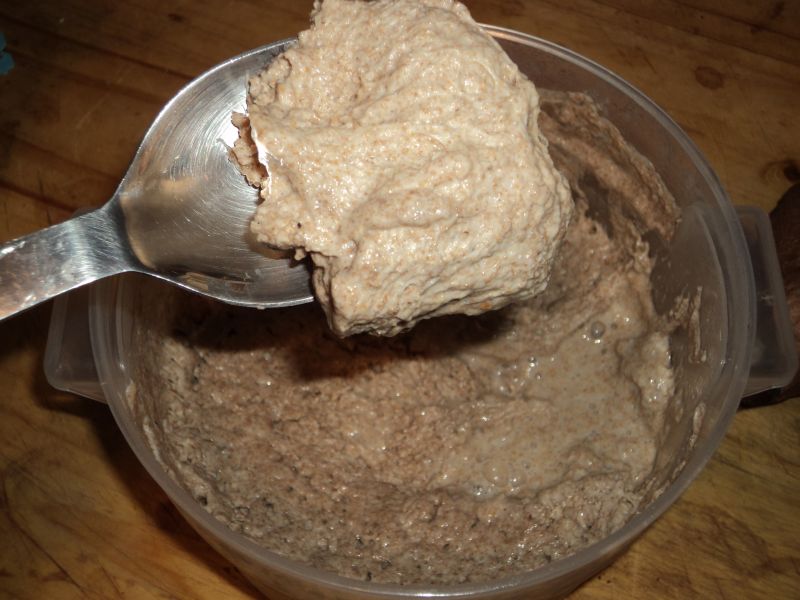 I started with a two day old starter made with whole wheat flour, but this can ferment for as little as an hour or up to three or four days refrigerated.