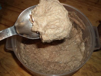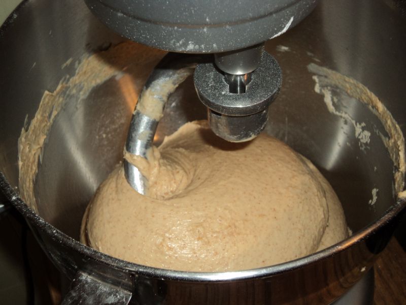 I then transferred the starter to the bowl of my mixer and added the cooked sweet potato along with a couple eggs, a bit of honey, and olive oil, and I mashed and stirred it with a spoon.
