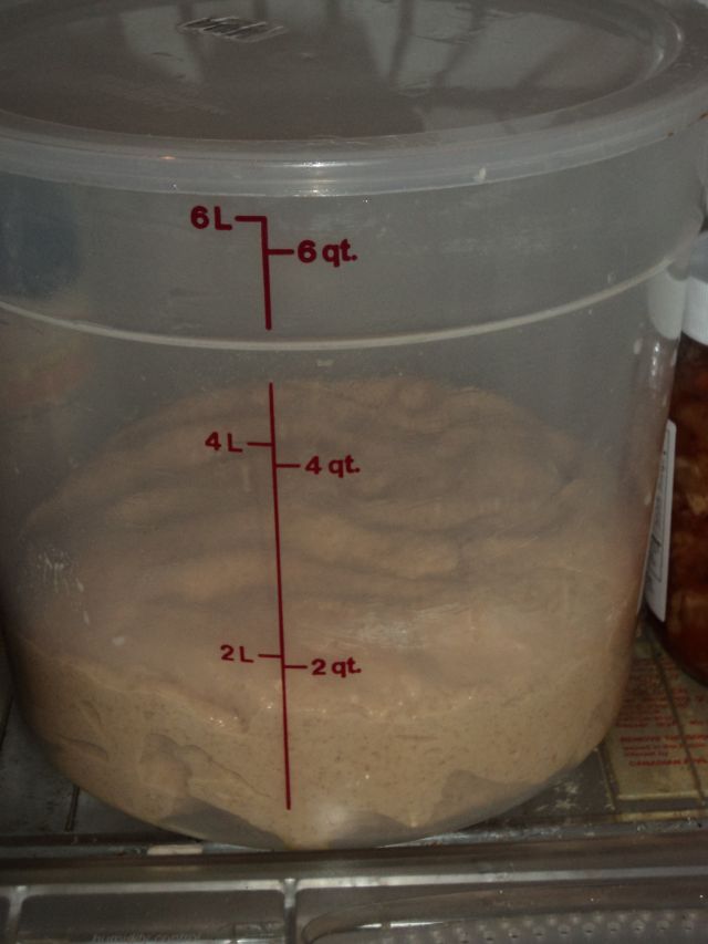 I transferred the dough to a rising bucket and refrigerated it while I went out to run some errands and make a brief stop at the health club. Here it is initially, then fully risen after three hours in the fridge