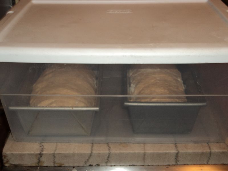 After cutting it into two pieces I shaped it and placed them into two loaf pans, which I then placed in a square plastic contains to rise (this acts as a sort of incubator and alleviates plastic wrap). Here they are initially, then fully risen after an hour at room temperature.