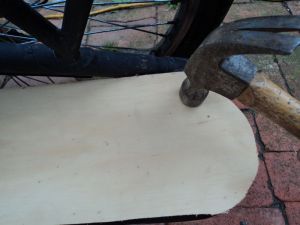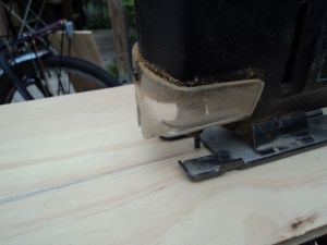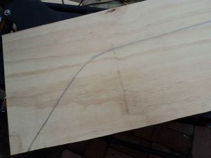 Next I cut the piece of wood in half, and cut it in length a bit as well, to make it more manageable. Then I rested it on the sidebar and traced it’s outline.