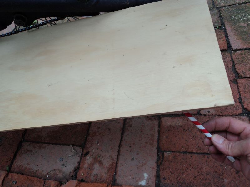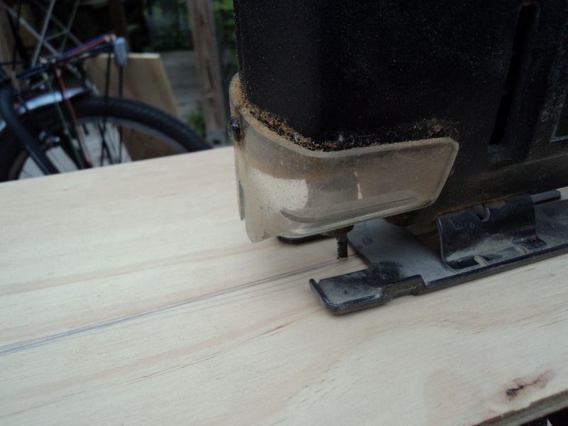 Next I cut the piece of wood in half, and cut it in length a bit as well, to make it more manageable. Then I rested it on the sidebar and traced it’s outline.