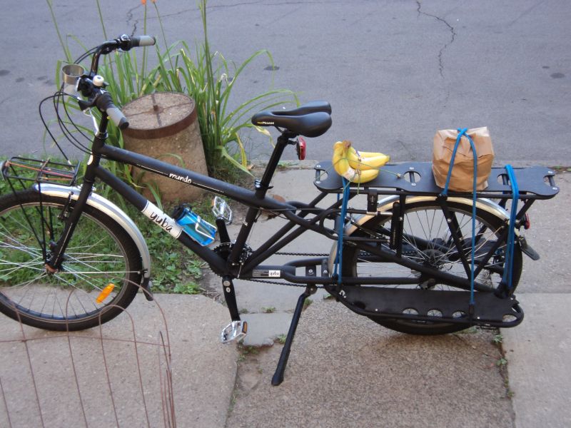 2. A recent load my panniers carried home was an Indian takeaway for two, along with a couple of bottles of wine to wash it down with.The 'nanas are a good one. Does that count as a fuel tank? ;>DNice bike btw :>]