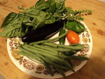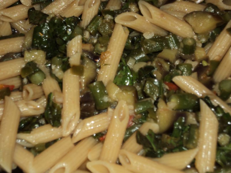 It is that delicious time of year when things are starting to come to fruition in the garden. I picked just enough vegetables for dinner tonight and made a variation of my favorite pasta dish…aglio e olio. Click here and here for earlier posts with pictures on how to make this dish with a recipe.