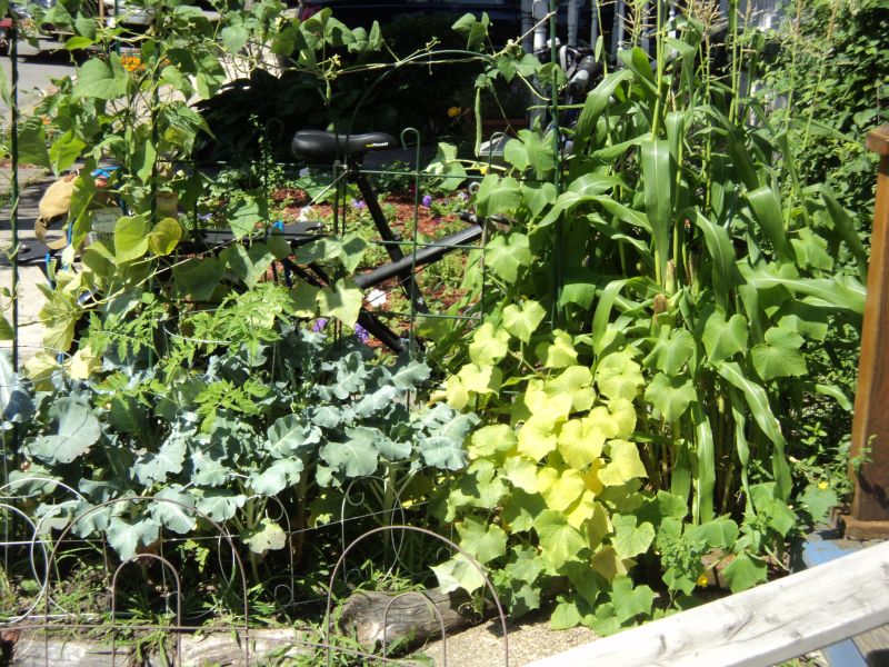 I Love this…as hot and humid as it has been this year I am really enjoying it. The garden is literally out of control. You can barley see the Mundo locked up to the hitching post behind the cucumber, broccoli, green beans, and corn. Whenever I start to get down about how hot it has been this year (especially in the kitchen…where I spend my days and some nights) I try to remember the frigid days of say…mid-January, when it gets dark by 4:30pm (16:30). Click here to see the same hitching post with one of my bikes (the mule) locked to it in the winter (and also a photo of the post nearly buried in snow)…I love the winter, but the older I get the shorter I wish summer was…right now, I’m loving the summer.