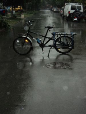 This evening after work I rode the Mundo to return a DVD that was due (lest I pay a late fee). Throughout the day today the humidity was so heavy the air had a certain haze to it. Rain was predicted but I was hoping I could make it home prior. As I made it to the store there were a few drops and the sky had become so dark it seemed to be nearly night time (but it wasn’t). Then as I pedaled home it was as if the clouds burst like a canopy too full of water…it came down in buckets. I only had a short ride (about a mile) and all I could do was surrender. At one point there was a very subtle decline in the road where I could coast pretty fast. I stood on the pedals and took it in. After spending the day in a hot kitchen it felt so good to be coasting through this downpour. Life is good, I thought to myself, as I passed cars carrying dry people. It’s good to use your own body to propel yourself, and it’s good to be in the natural elements such as a rain fall or snow storm. It makes me remember that I am not in control. And I need this reminder more often than not…sometimes it’s the little things that make me feel truly alive.