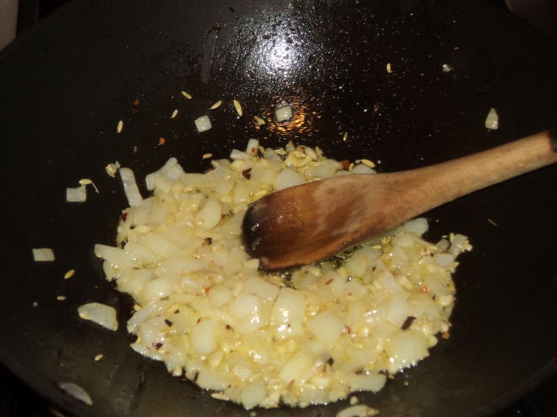 Saute diced onion and minced garlic in olive oil; I also add a few crushed pepper flakes and fennel seeds.