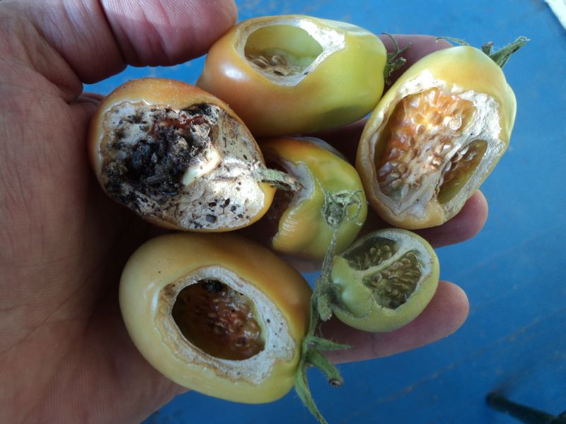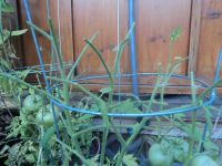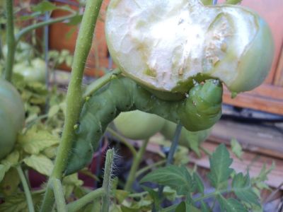 I’ve been growing tomatoes for years (my favorite plant) and have never had a problem with these critters. Here’s a couple photos of the devastation in my front yard garden (click for a larger view), the backyard–which only has a couple tomato plants–seems OK at present.