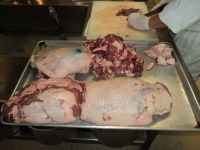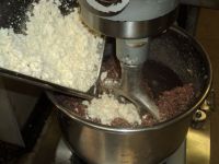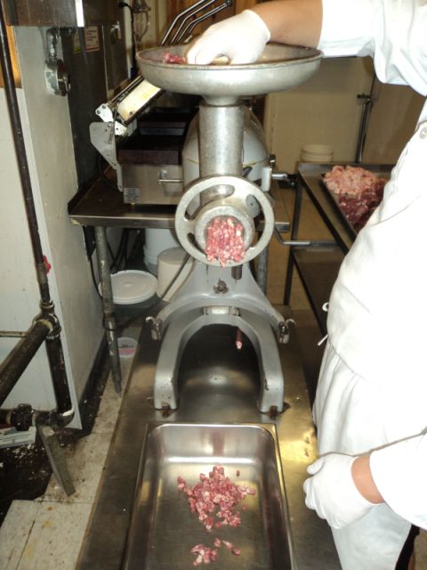 In it’s most basic form sausage is nothing more than ground and seasoned meat, which may or may not be stuffed into a casing (it can, of course, be cooked in a patty shape). One of my favorites of this patty style is a recipe based on a basic kibbeh recipe (lamb and bulgar), but any meat will do (pork is the most obvious choice). For a lamb and bulgar recipe (different than the pictorial recipe below) click here. It’s a recipe I published some time ago and recently found it pirated when I did an ego search. Anyhow here’s the sausage we made today, and no that is not me in the photos…it’s Steve, one of my cooks at work who was learning the fine art of charcuterie. Thanks Steve, great job! (click any photo for a closer look)