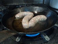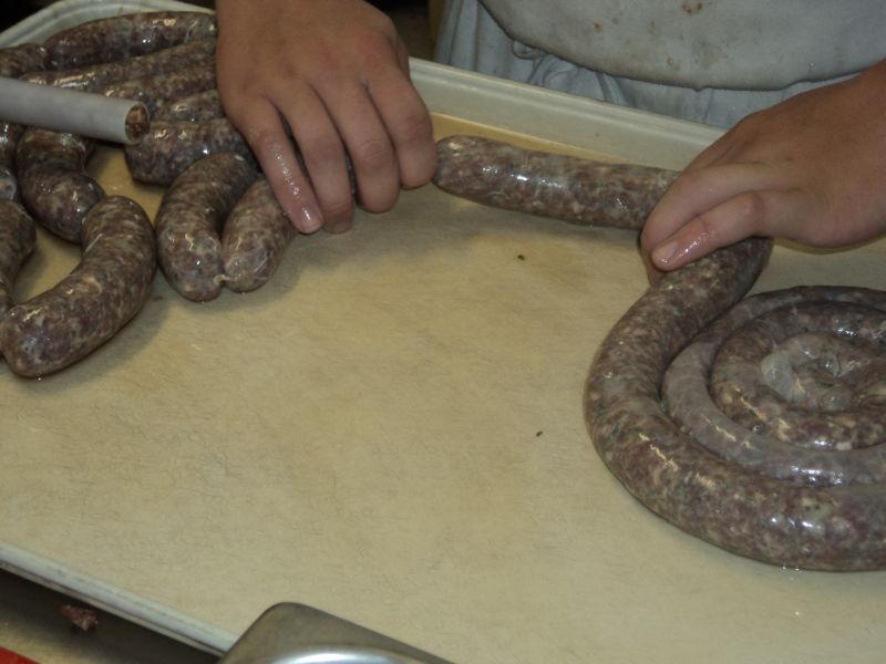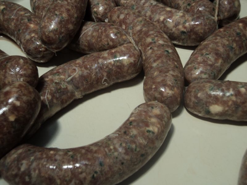On a small scale sausage making really fascinates me. Other than the aid of electric grinders it is done pretty much the same way as it has been for millennia. It began–and still serves the purpose–of not only making something really good to eat, but more so, it utilizes many parts of the animal (the casings are intestines, for one, but also lesser cuts of meat can be made tender by grinding them). And in regards to using an animal’s intestines for the casing…first of all what’s the difference if we eat its muscle (meat) or its intestine (casing)? It’s all from the same animal…both are wholesome. And personally I would rather eat a natural casing than a synthetic one (man made).