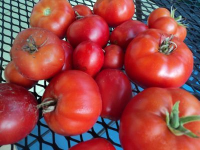 Despite the incredible devastation to my tomato plants by an enormous hornworm I’m still able to collect a fair share of tomatoes (click here to see a picture of the scary hornworm in action). This was today’s collection, there’s more to come yet…looks like there’s tomato sauce in my future this summer after all…although probably not enough to last me through the winter.