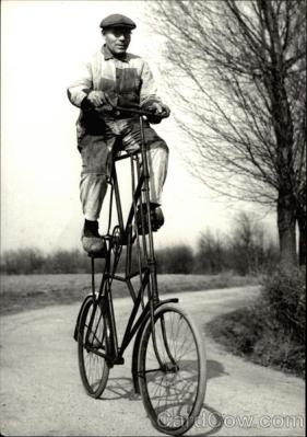 Though I’ve never ridden one I’ve been intrigued by tall bikes for a while. I’ve also posted on them in the past, specifically about a local bicyclist-bike builder, Jason (click here and here). Anyhow, I came across this photo at CardCow.com today and was immediately impressed. The site does not say what year this is from–but it’s obviously old–nor does it say where it is from, but it looks like he’s wearing wooden clogs so I’m assuming it is Holland. Pretty cool. He sure looks proud of himself…and he should. I always assumed tall bikes were the product of America, and somewhat current (typical Yank right?…thinking everything he likes comes from the U.S.), but this obviously proves my theory wrong. If anyone knows the history or origin of these bikes I’d love to hear it.