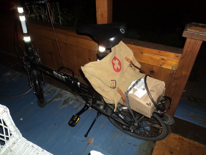 A small cardboard box containing three pints of homemade dog food and three sample packages of wild rice from Goose Valley Wild Rice.