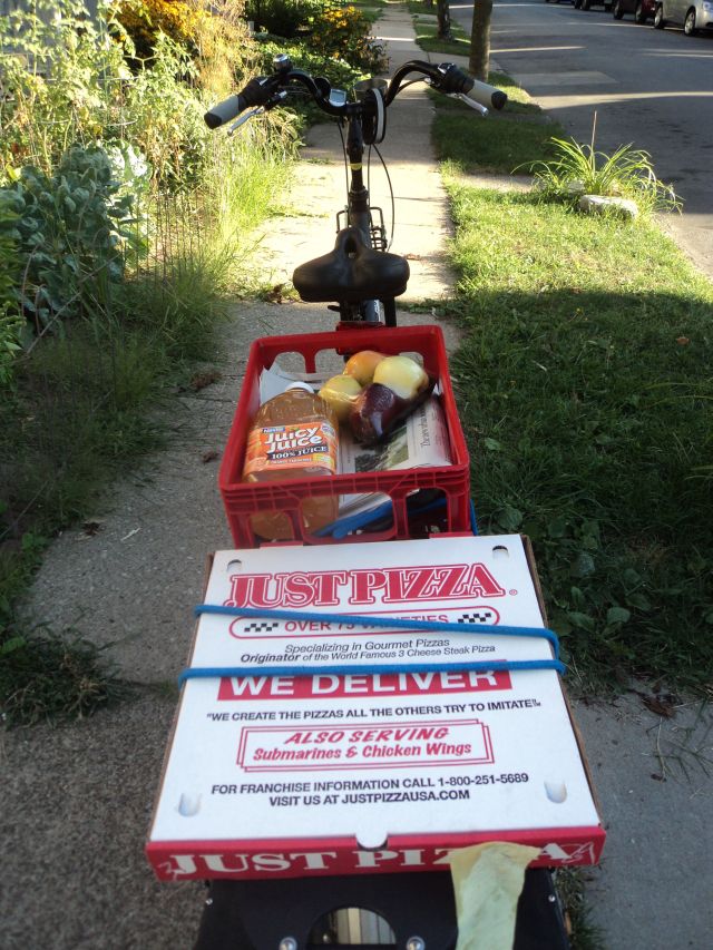 Things That Can Be Carried On A Bike (#209) Posted byJoeAugust 30, 2010December 6, 2011Posted inThings that can be carried on a bike, urban simplicityTags:Things that can be carried on a bike, urban simplicity Four pieces of fruit, a Sunday newspaper, and a large spinach pizza. Share this: Click to share on Facebook (Opens in new window) Facebook Click to share on X (Opens in new window) X Like Loading... Related