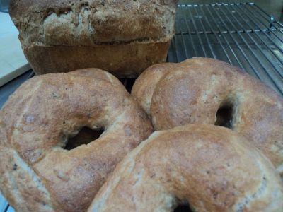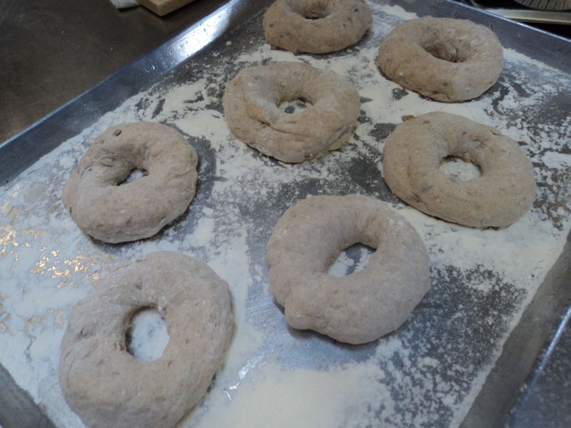 Today at work I made Ezekiel bread for the simple reason that I like making it and it is my favorite bread…and I believe it is exceedingly healthy. What was different with today’s bread was that I made half of the dough into bagels. Now many bread bakers may disagree with me, but I find that the main difference between regular bread and bagels is how it is cooked…bagels are poached before they are baked (a little sugar and baking powder is added to the water to give the baked bagels their sheen). Anyhow, I’ve made bagels before but not Ezekiel dough and thought I’d give it a try. The resulting bagels were delicious…tender and chewy at the same time, yet full flavored because of the ingredients in the dough. To see earlier posts with pictures and recipes on making Ezekiel bread dough click here and here. Now here they are in pictures.