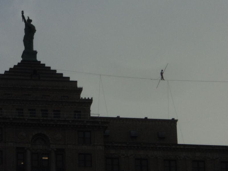 This has nothing to do with Urban Simplicity other than it was simple entertainment in the city…and it is without doubt something you don’t see every day. A French high wire artist, Didier Pasquette, walking on a wire 23 stories high. He walked between the two towers of the Liberty Building to signify the start of the local 3-month arts exhibition called Beyond/In Western New York. The entire walk to less than 3 minutes…but it was pretty cool.