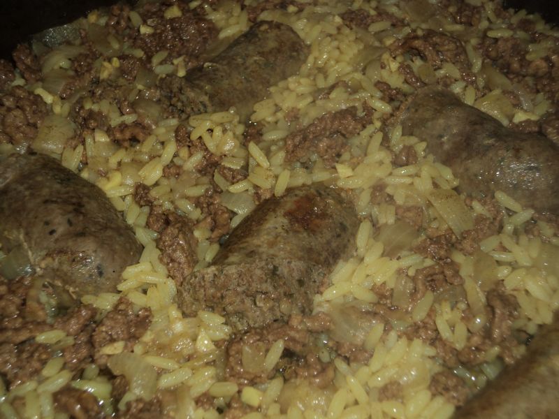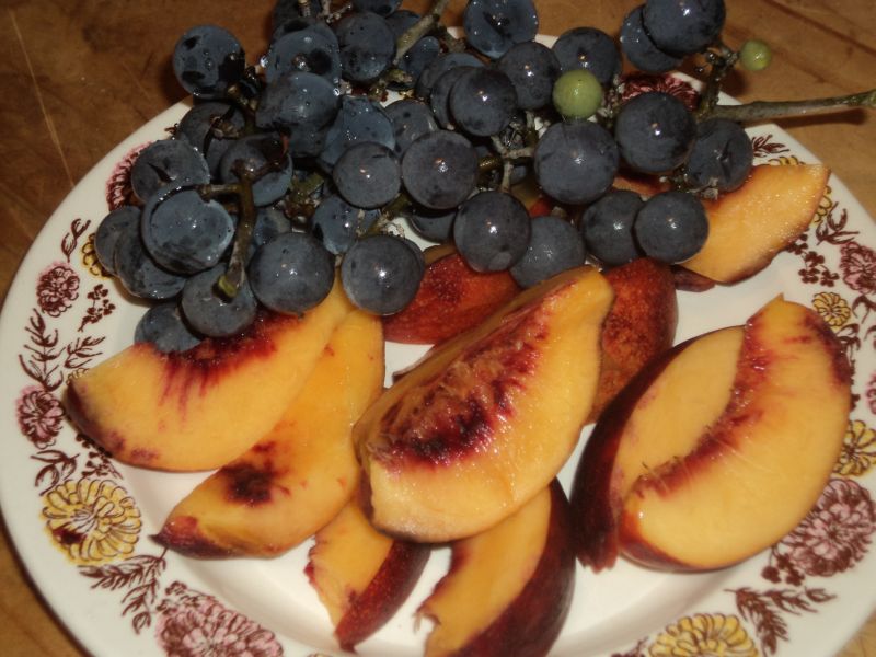 I’ve often said that one of the innate abilities of a professional cook is the ability to make a really good meal out of even the most ingredients….well these were far from meager. In the garden I found a small eggplant, a hot pepper, and a stalk of broccoli (and it’s almost October!). In the fridge I came across a couple links of lamb sausage (click here to see it being made) and about a 1/2 pound of ground beef; I used both of these to make a variation of Lebanese-style rice (click here for photos on how to make this dish, and click here for a recipe). I picked a handful of grapes from the backyard (click here) and also found a bruised peach in the fridge. As for the vegetables I sauteed very slowly and basted them in olive oil with a little garlic and sea salt. The meal was delicious (and I have enough leftovers for tomorrow); I ate it with my son while we watched a Sapranos re-run. Anyhow, here’s a few pictures.