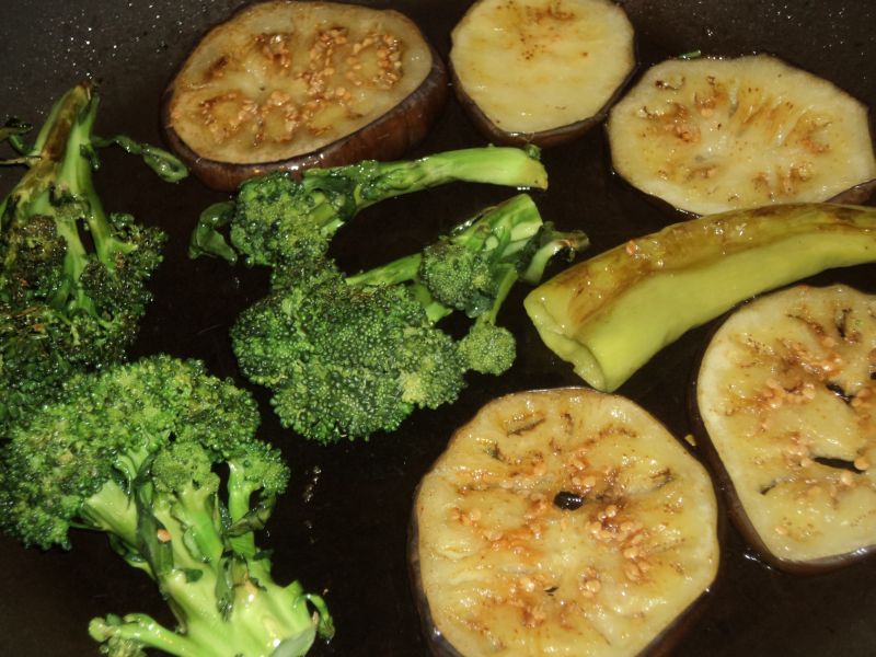 I’ve often said that one of the innate abilities of a professional cook is the ability to make a really good meal out of even the most ingredients….well these were far from meager. In the garden I found a small eggplant, a hot pepper, and a stalk of broccoli (and it’s almost October!). In the fridge I came across a couple links of lamb sausage (click here to see it being made) and about a 1/2 pound of ground beef; I used both of these to make a variation of Lebanese-style rice (click here for photos on how to make this dish, and click here for a recipe). I picked a handful of grapes from the backyard (click here) and also found a bruised peach in the fridge. As for the vegetables I sauteed very slowly and basted them in olive oil with a little garlic and sea salt. The meal was delicious (and I have enough leftovers for tomorrow); I ate it with my son while we watched a Sapranos re-run. Anyhow, here’s a few pictures.