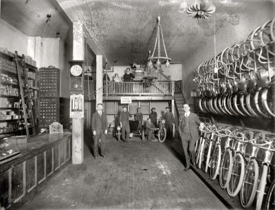 I love old photos…they are truly a glimpse to the past. I found this one at Shorpy.com.They call this photo Bike Shop:1919, but I renamed the post 1919 Mechanic’s Shop because of it’s content. Around 1919 automobiles and motorbikes were gaining popularity, but what many don’t know is that the first auto mechanics were bicycle mechanics; it was a logical transition. Look at the mechanics in the background…are they standing proudly in front of a new shiny bike? Nope. They’re huddled around a car and a motorcycle. In fact even the Wright Brothers, famous for their aeronautical feats, where originally bicycle mechanics and used many bicycle parts on their original airplane (click here). At that time the mechanics were probably enthralled by the new engines they were learning about and working on (and who could blame them). According to the clock and calendar on the wall it was about 2:50pm (14:50) on a December afternoon in Washington DC. Interestingly, it was about this same time period (maybe a decade or so earlier) that the Wright brothers had their bicycle shop and were members of League of American Wheelmen, which later became the League of American Bicyclists. The league, ironically, relocated to Washington and still exists today (click here). While the bicycle, at the time of this photo…or shortly thereafter, was on a bit of the wane for a while, it has thankfully been making a resurgence, not just as a recreational toy, but as a mode of transport…they are once again being seen (by some but not all) as a serious machine that may in fact outlive the car (at least what we now know as a car). Our planet now needs bikes and other human transport more than ever; we as a population need them more than ever…it has taken us a little more than a hundred years to realize this. Now is a great time to be a bicyclist…for many reasons.