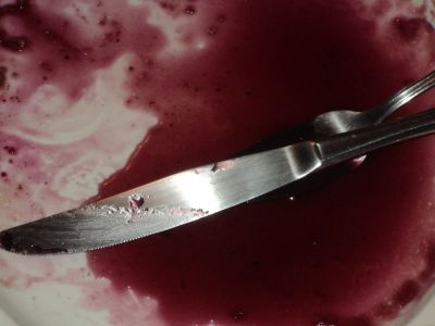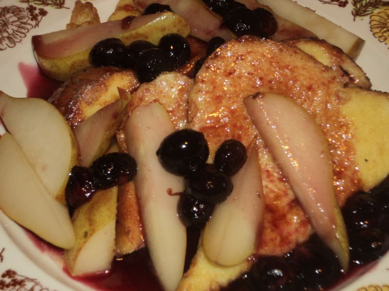 This morning I made French Toast (pain purdu for my Francophile readers) for my teenage son; his favorite breakfast of all time. This is a variation of a recipe I’ve made for him before (click here for additional and more explicit pictures). This time I used challah bread which I carried home on my bike yesterday. I made the syrup using fruit juice, a little sugar, blueberries which I had in the freezer, and some fresh pear. Did he like it…well, you’ll see in the last photo. For a very basic recipe for French Toast from the Food Network, click here. To see better step-by-step directions for making the syrup from a previous post, click here.