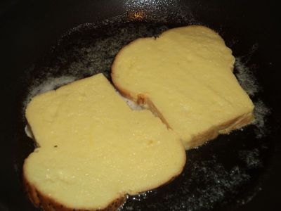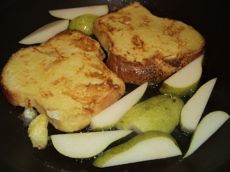 This morning I made French Toast (pain purdu for my Francophile readers) for my teenage son; his favorite breakfast of all time. This is a variation of a recipe I’ve made for him before (click here for additional and more explicit pictures). This time I used challah bread which I carried home on my bike yesterday. I made the syrup using fruit juice, a little sugar, blueberries which I had in the freezer, and some fresh pear. Did he like it…well, you’ll see in the last photo. For a very basic recipe for French Toast from the Food Network, click here. To see better step-by-step directions for making the syrup from a previous post, click here.