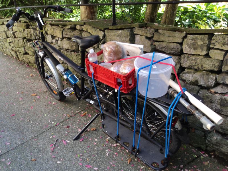 #226 (bottom photo)…Three loaves of whole wheat bread, an empty plastic bucket, a soda crate, a newspaper, a pint of chopped beef (for the pugs), a bottle of water, a 14″ piece of steel pipe, an 18″ piece of PVC pipe, and a couple new bicycle repair tools.