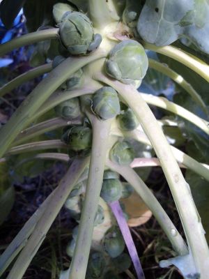 Over the years I have really grown (pun intended) to love cruciferous vegetables but have never really had much luck in my garden with brussels sprouts…usually all leaf and no vegetable. But that’s not the case this year. I have 4 plants growing in my front yard about 12 inches from the sidewalk. Maybe it was the hot summer and damp fall but the conditions must have been right…I was surprised today when I lifted their leaves to see the stalks covered in baby brussels sprouts; cabbage is doing well also (click here to see pictures). Anyhow, I was excited enough about this (it’s the little things, right?) that I thought I’d share a few pictures.