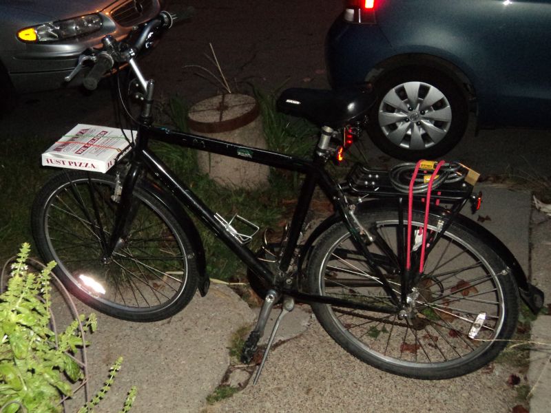 As I was pedaling home with pizza on my front rack, and seeing the words “We Deliver” on the box, I thought a couple things. One was that I deliver also (my own pizza, that is), but it also reminded me of a pizzeria I saw when I was in Boston on holiday a couple years ago…The Upper Crust. Their pizza is good, but that’s besides the point. The reason I mention them is that they deliver by bicycle (though I’m not sure if it is exclusively by bike). They have large wooden boxes attached to the back of ordinary mountain bikes, and when I say large I mean large (click here or here to see photos)…they sure could use a Mundo. There are a few locations but the one that I ate at was in Beacon Hill…if you’ve been to Boston you know how steep the streets are in that neighborhood…I wonder if the delivery people are allowed to eat free pizza for carbs (fuel).